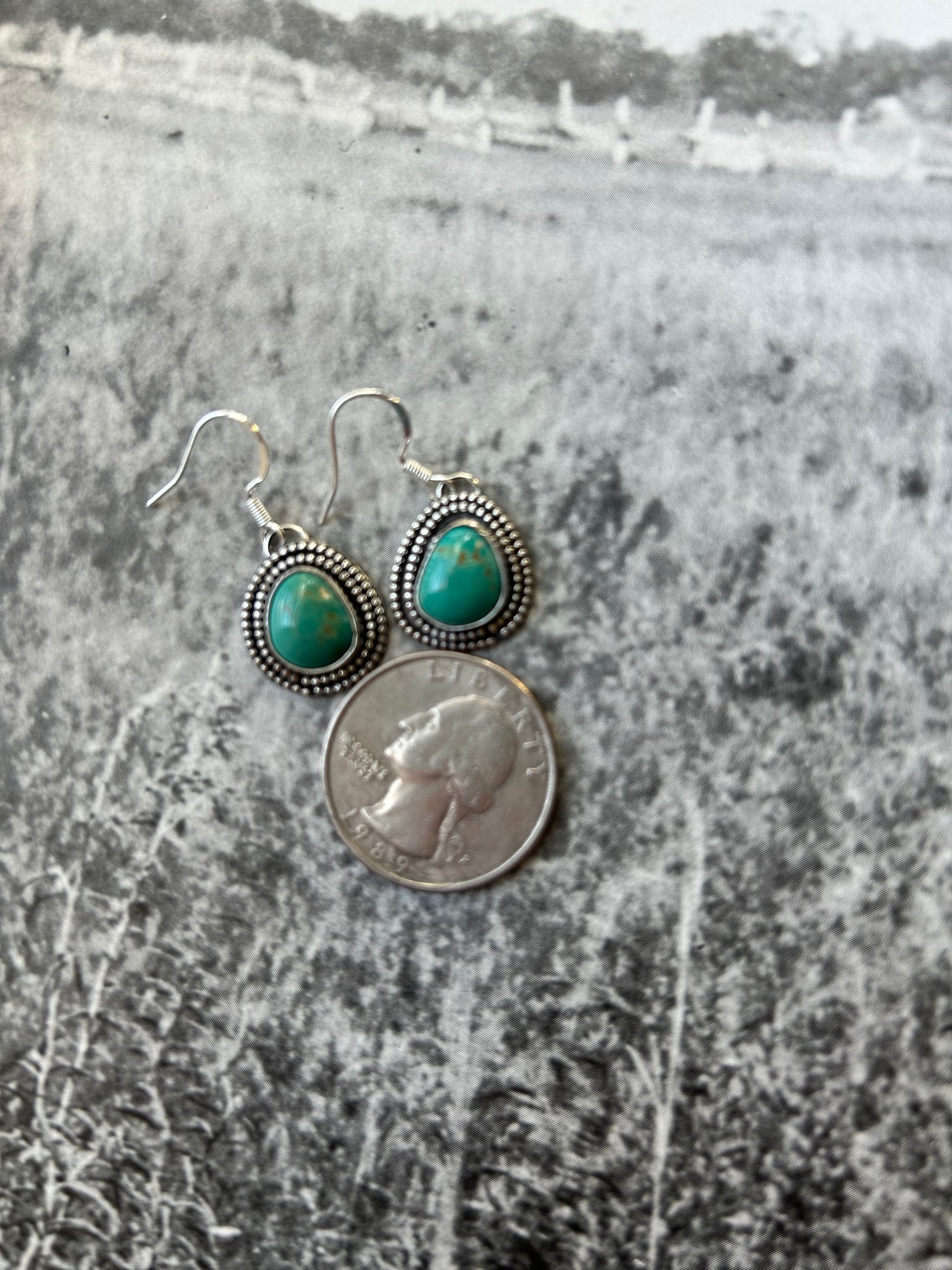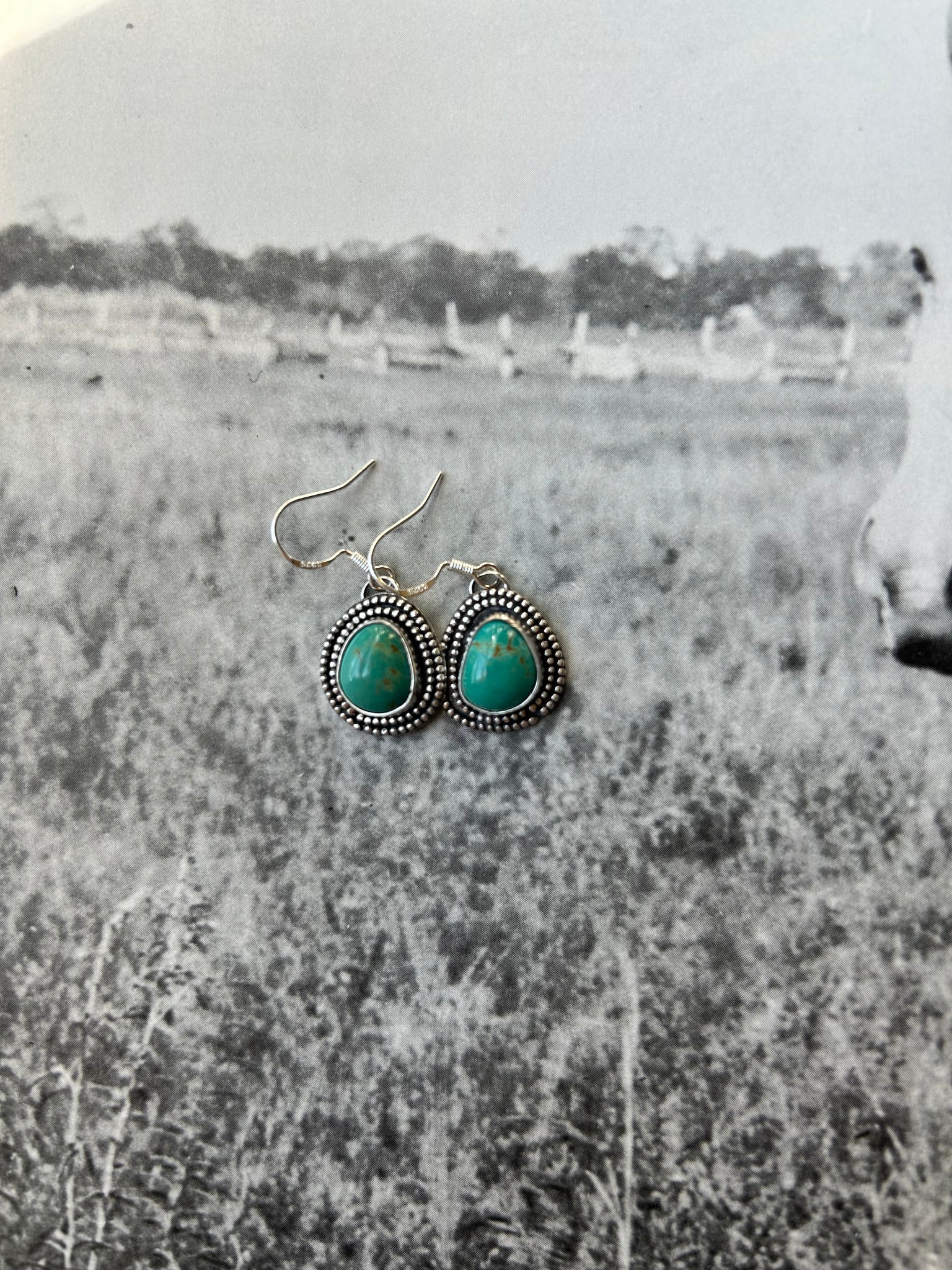 Handcrafted from sterling silver, these earrings feature stunning Sonoran turquoise stones in a deep, earthy green tone. Each stone is framed with a delicate beaded wire border, adding a subtle touch of texture and detail. Lightweight and easy to wear, they bring a natural elegance to any look without feeling heavy or overstated.