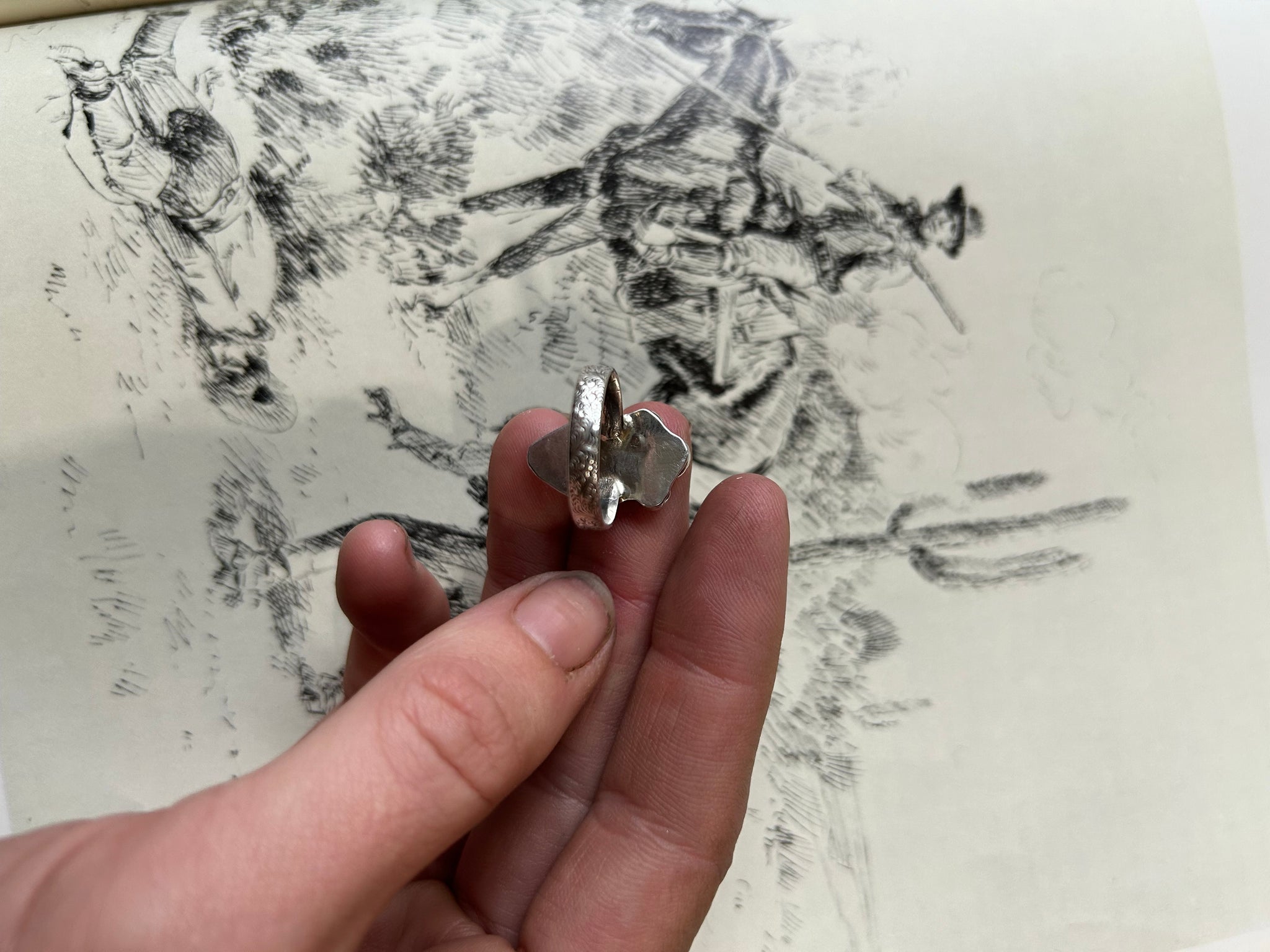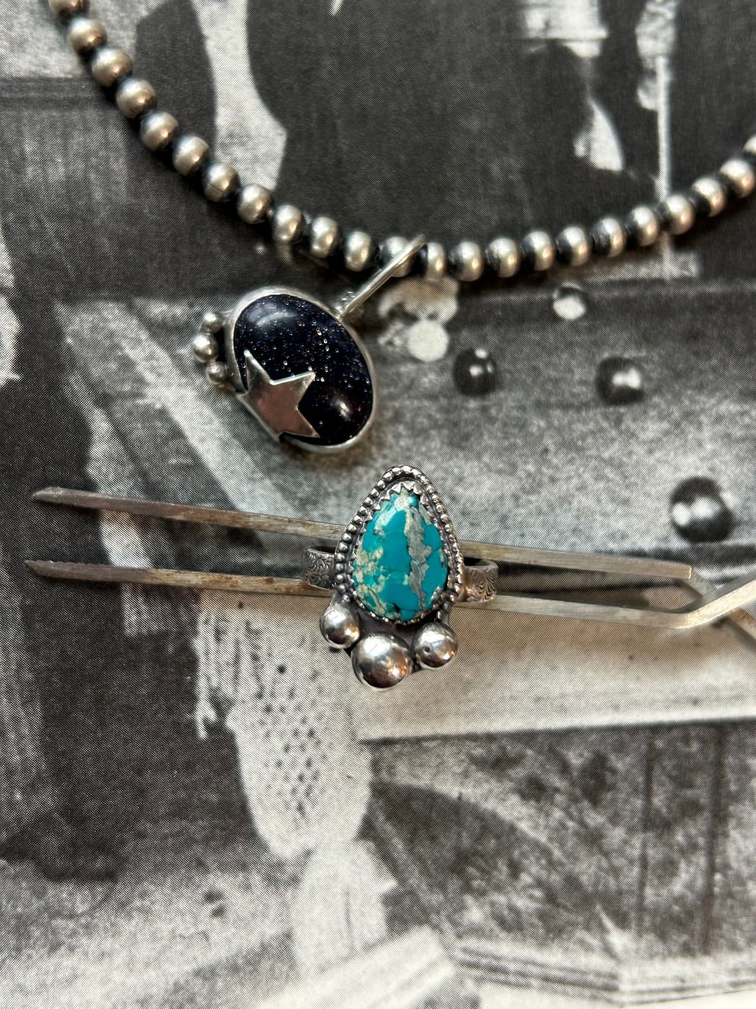 This ring is small and the ring band is very comfortable for all day wear. This ring would stack great with an everyday stack or be a great start to any collection. The color of the turquoise is very beautiful with a cool grey matrix running through it.
